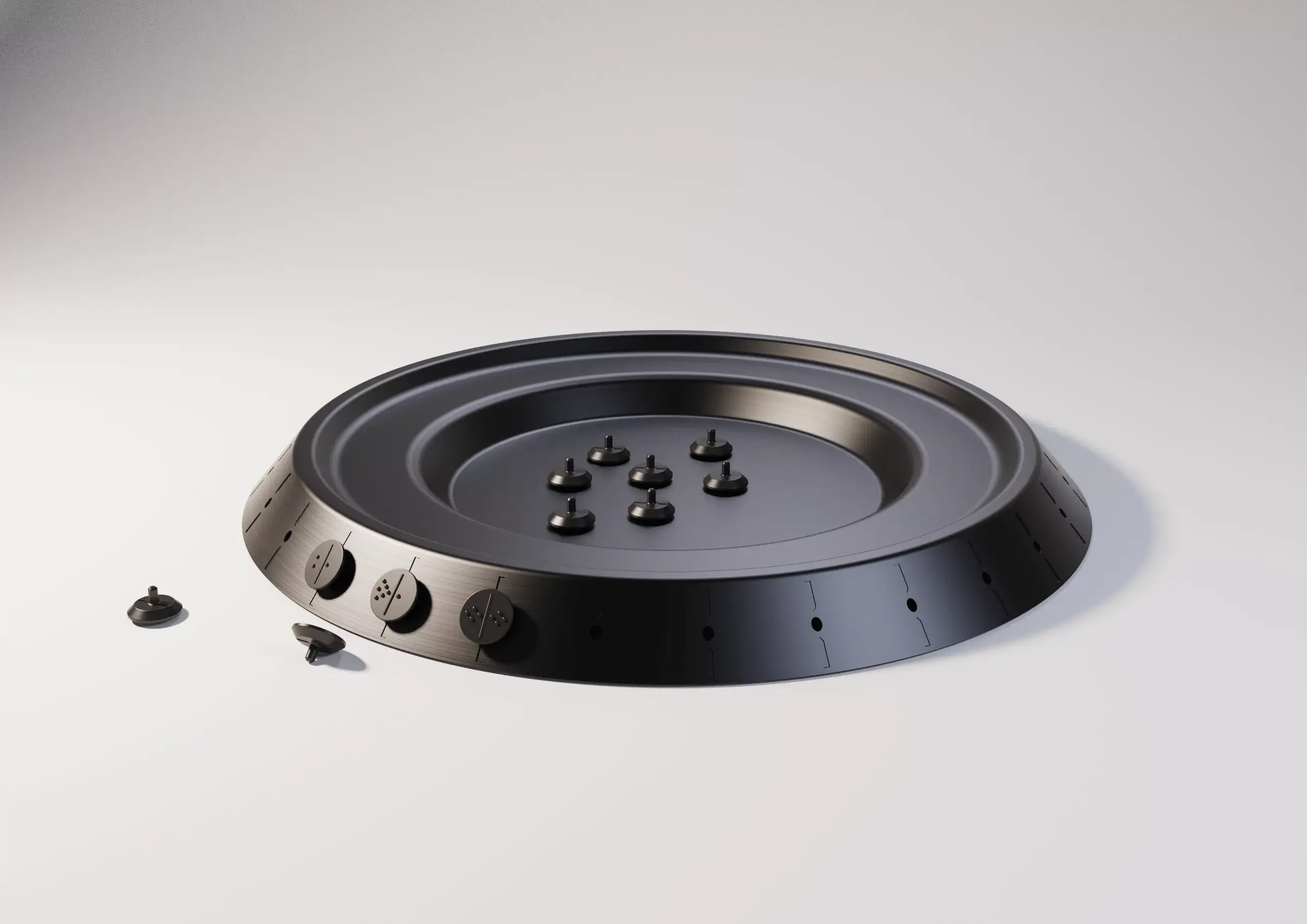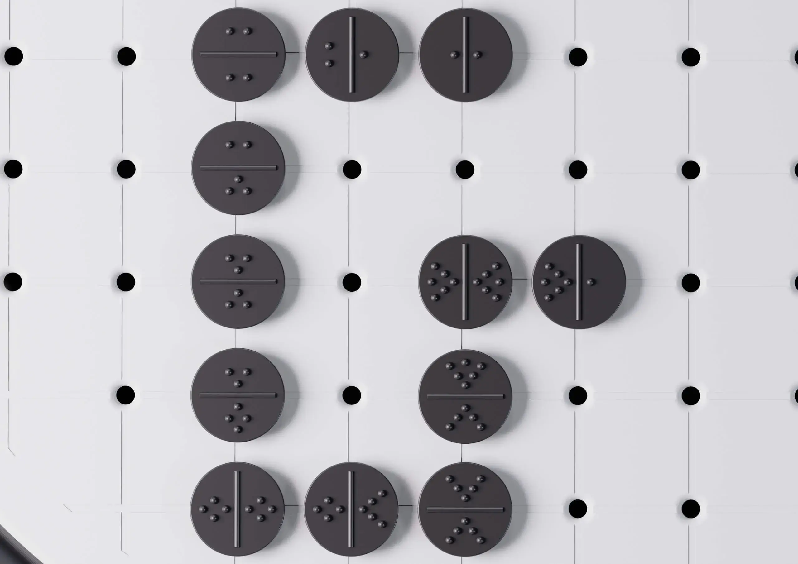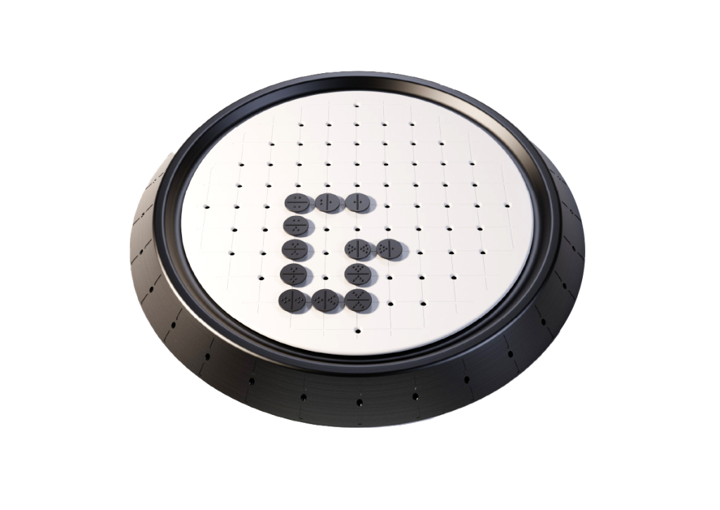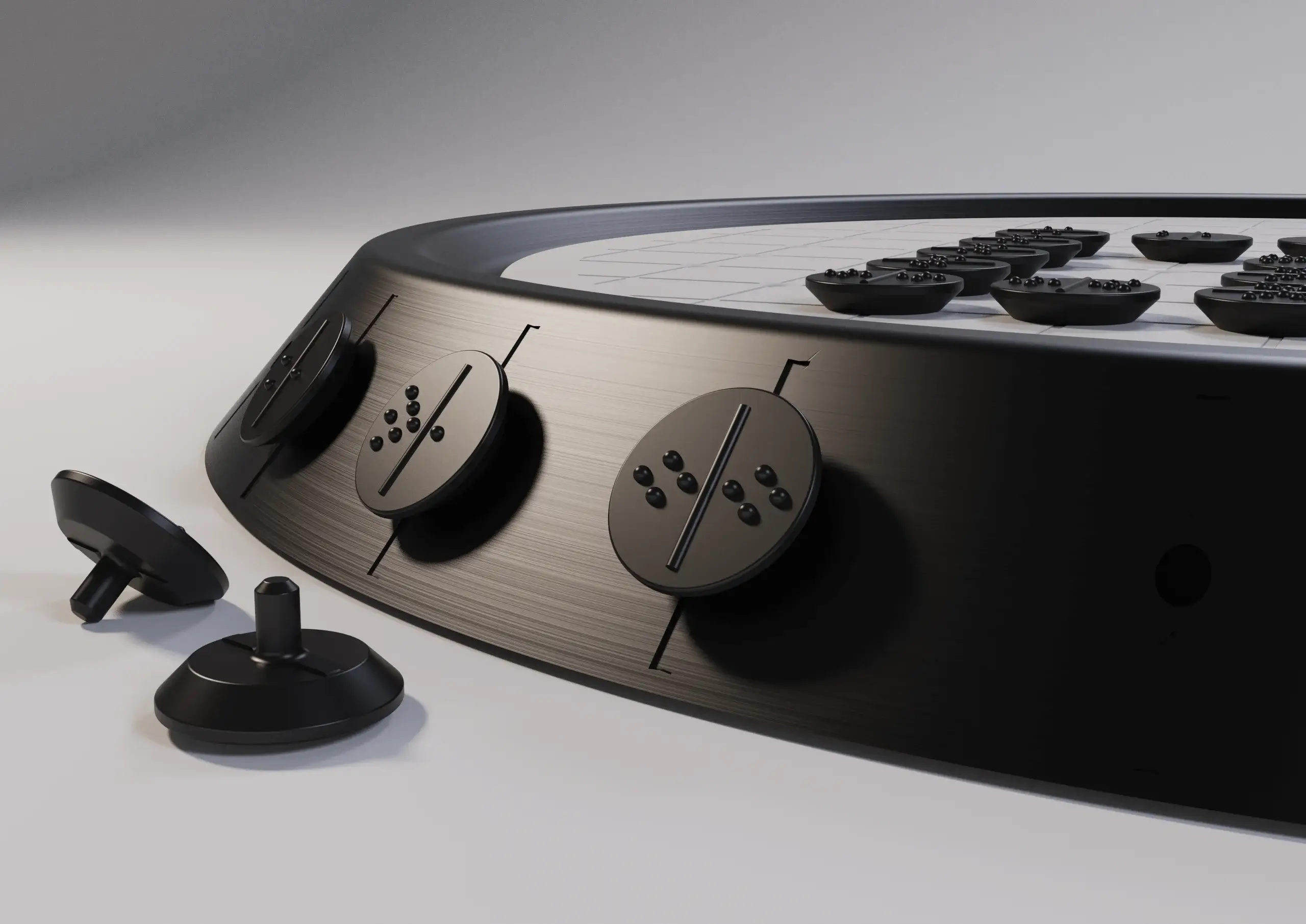 The board's base features cutouts facing the participants, ensuring that the domino pieces are concealed from the opponent's view, regardless of their vision. Each circular cutout includes a recessed vertical line, serving as a guide for accurate placement.