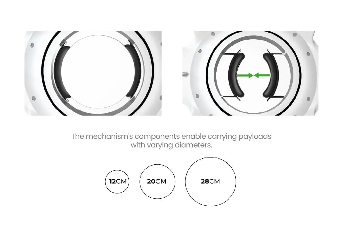 The body of the drone is a circular structure with a slightly domed top. It houses essential components, such as cameras, sensors, batteries, flight controllers and GPS modules, in addition to other common components found in drones, also features a small circular button near the center. It is integrated with the radial arm structure that supports the propellers.