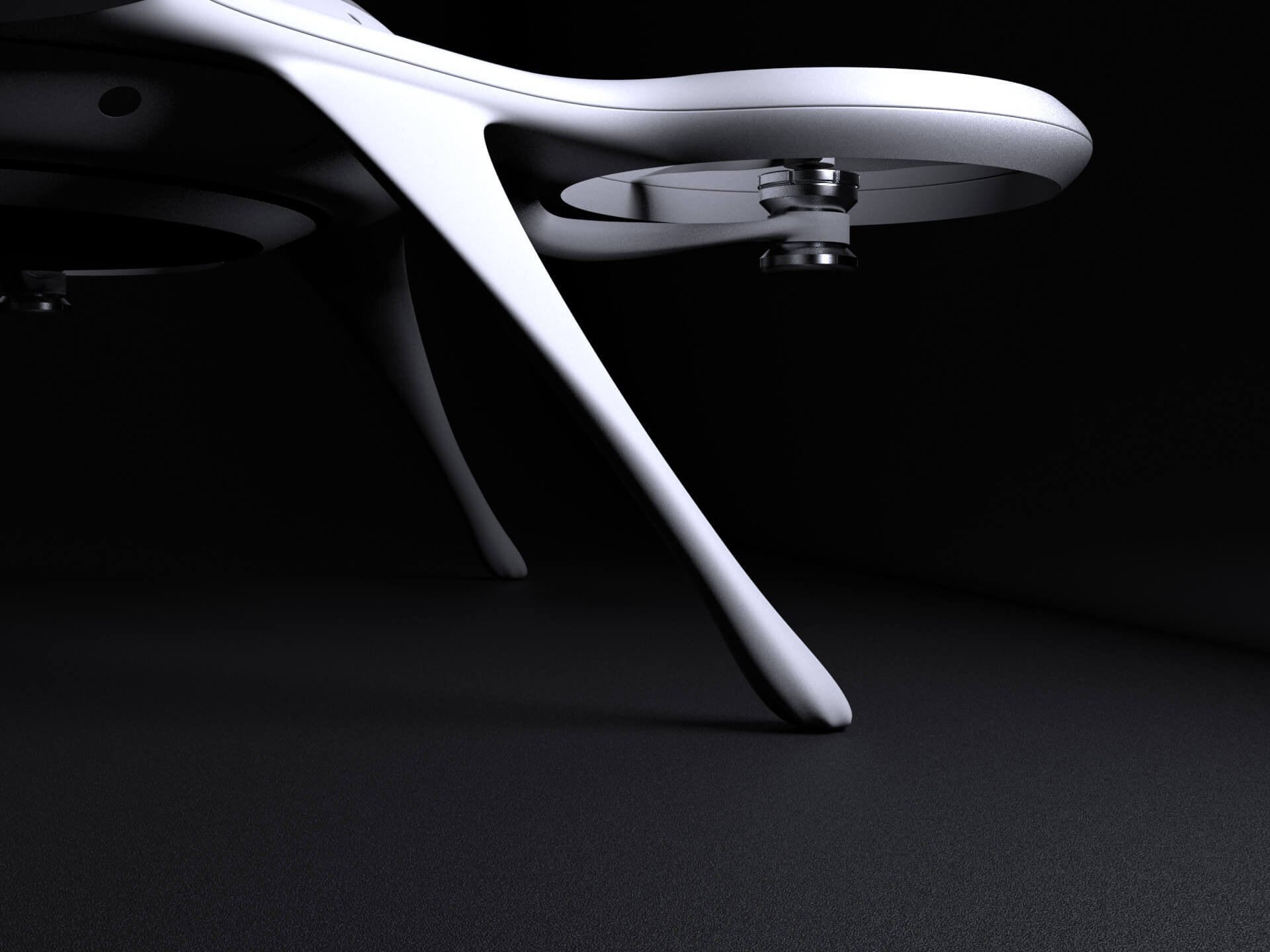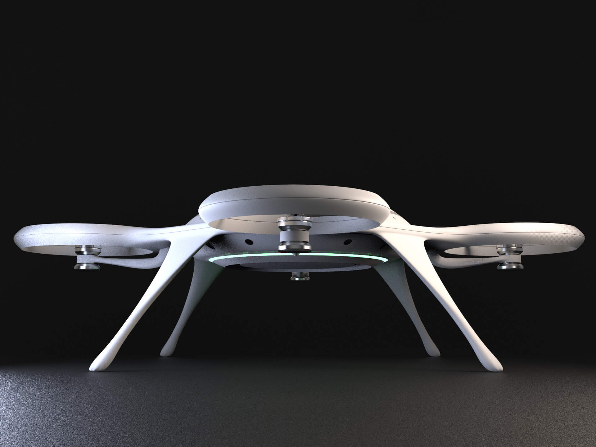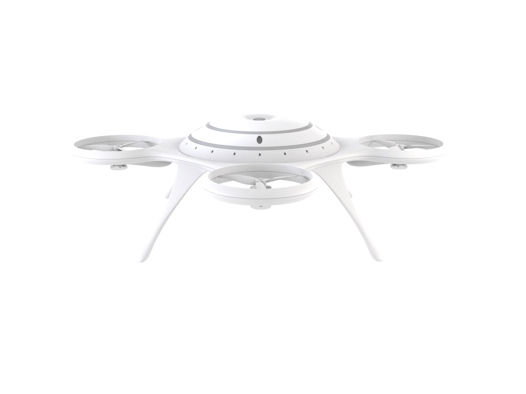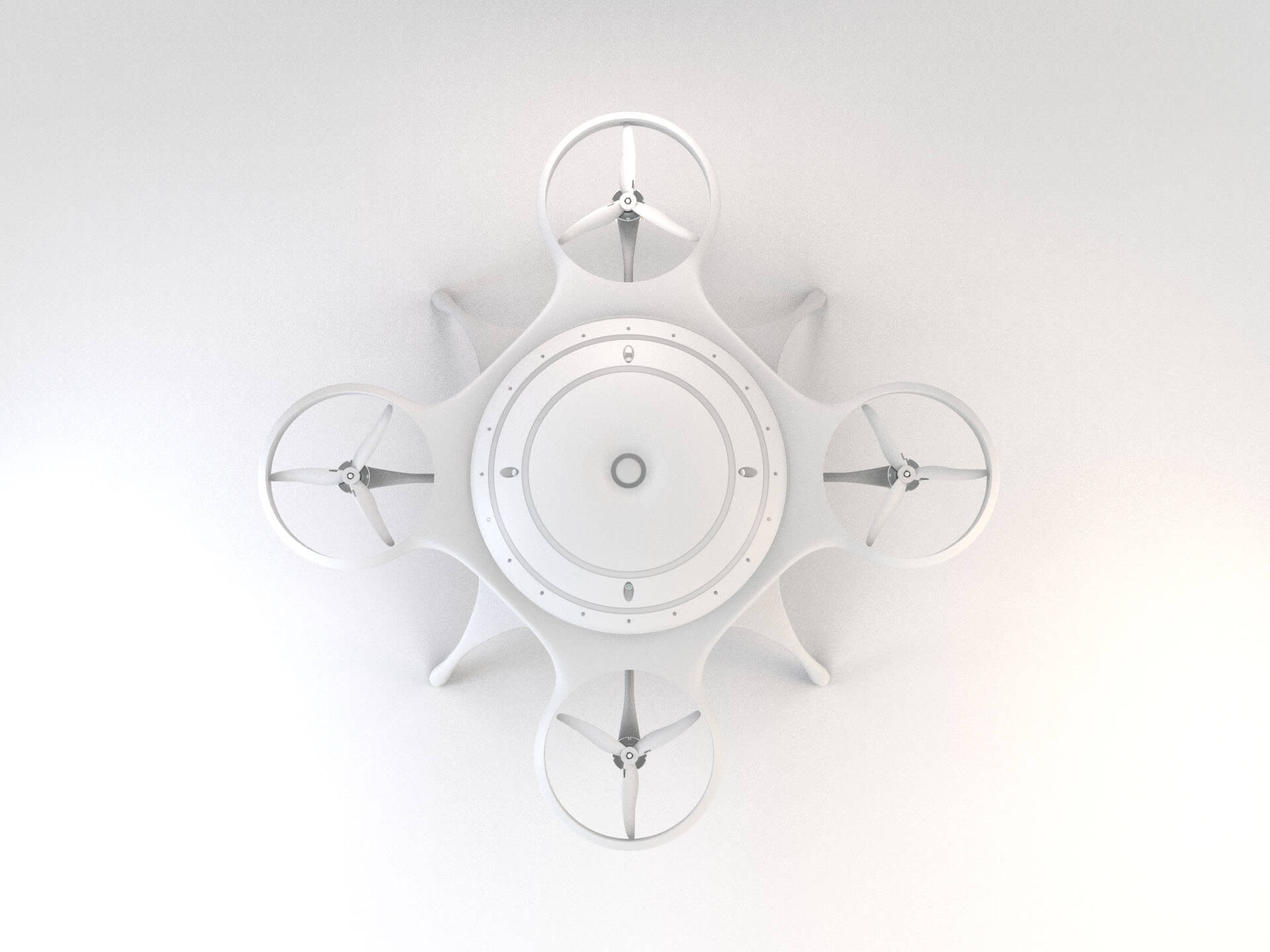 The drone comprises multiple components. Its form integrates organic and geometric elements in a radial and symmetrical design, providing stability and enabling 360-degree camera coverage.
