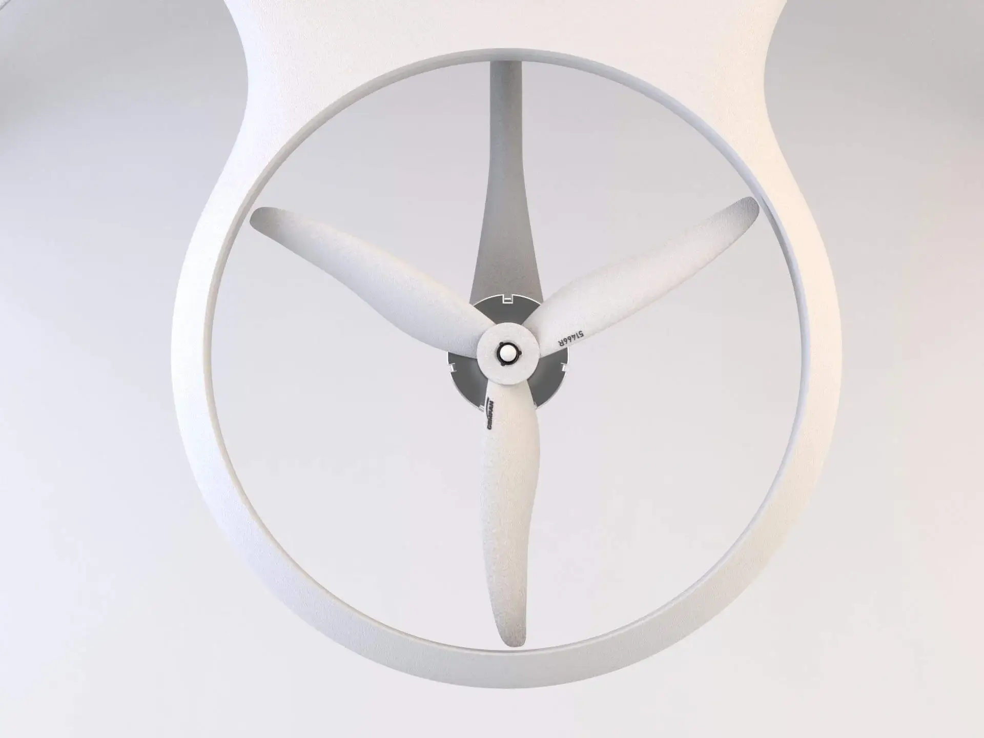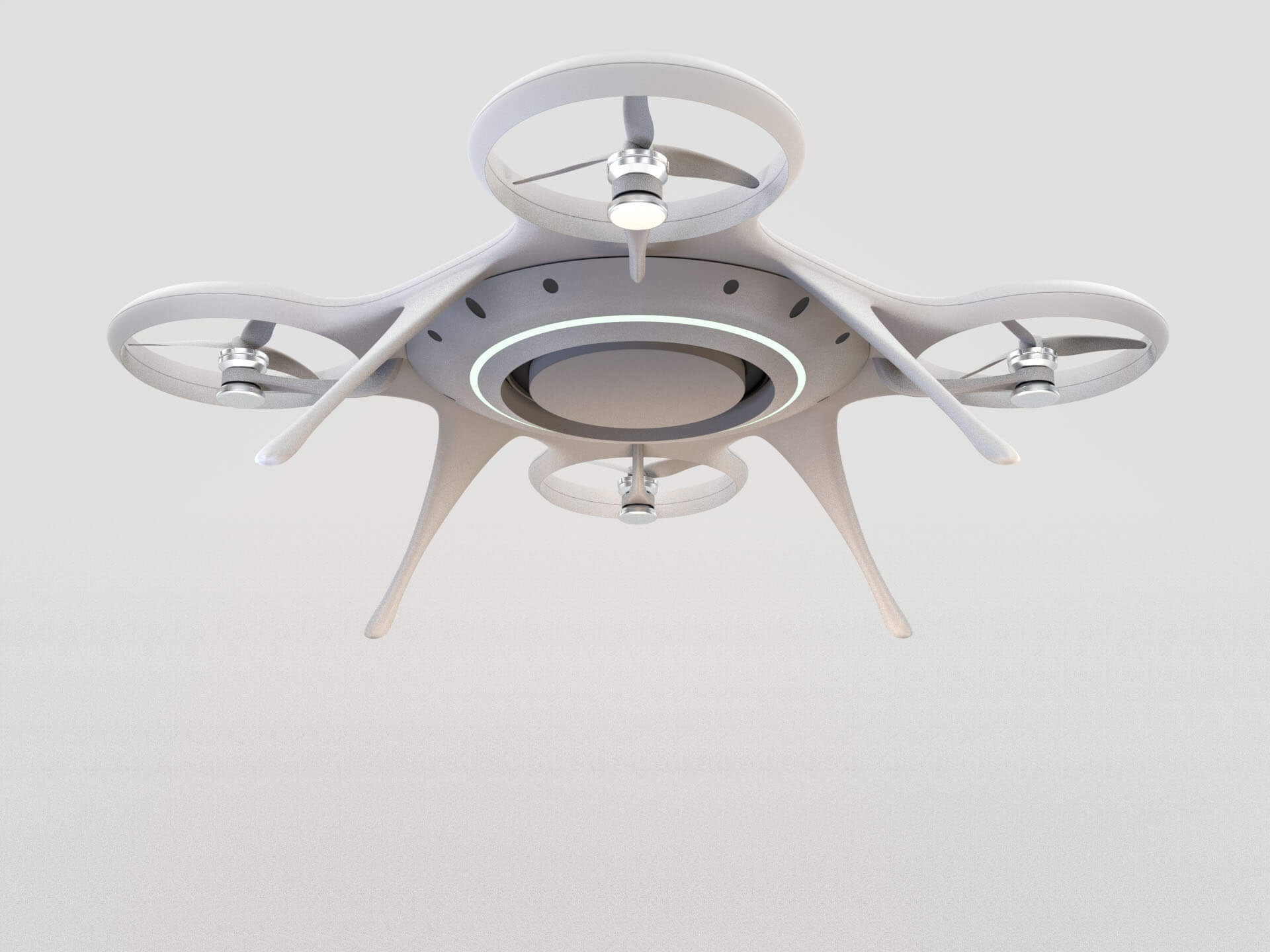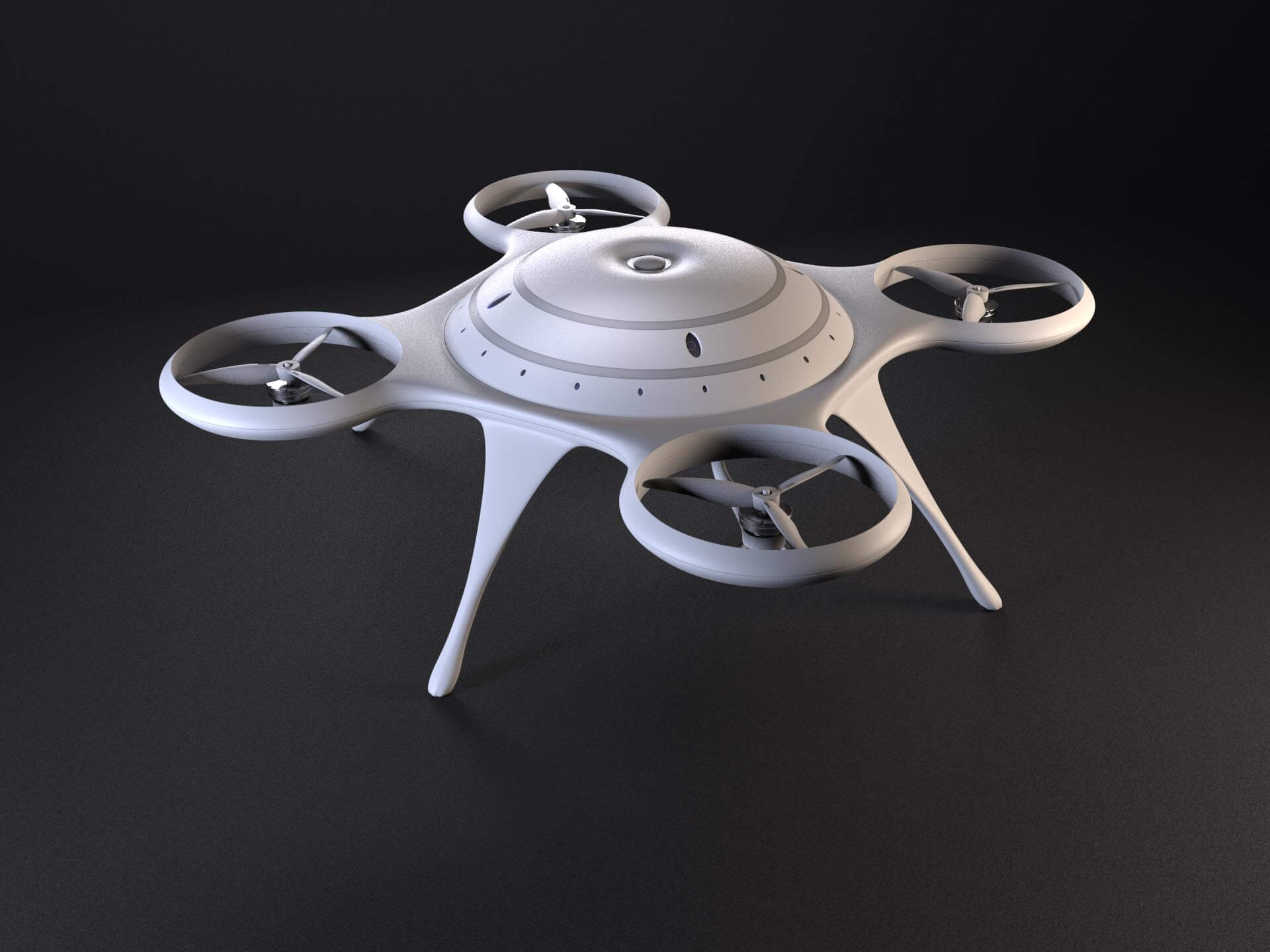 The drone comprises multiple components. Its form integrates organic and geometric elements in a radial and symmetrical design, providing stability and enabling 360-degree camera coverage.